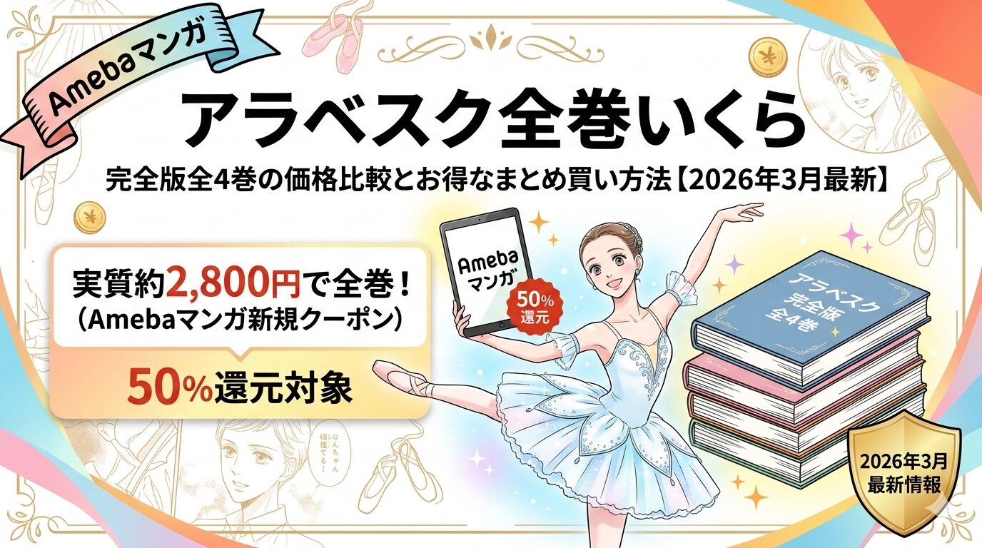 山岸凉子の名作バレエ漫画『アラベスク(完全版)』全4巻の定価は税込6,160円です。しかし、Amebaマンガの新規登録で使える100冊まで最大50%即時還元クーポンを活用すれば、実質約2,800円で全巻まとめ買いが可能。2026年3月時点で最安の購入方法をわかりやすく解説します。
