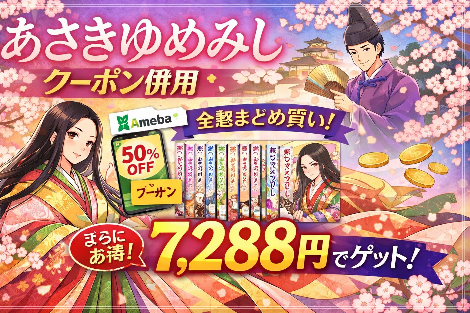まず、Amebaマンガに新規登録すると自動配布される「100冊まで50%即時還元クーポン」が最大の武器です。「あさきゆめみし 完全版」は全10巻なので100冊枠に余裕で収まり、全巻にクーポンを適用できます。通常14,575マンガコインの全巻セットが、購入後に7,283コイン分が即時還元されるため、実質約7,288円で手に入ります。