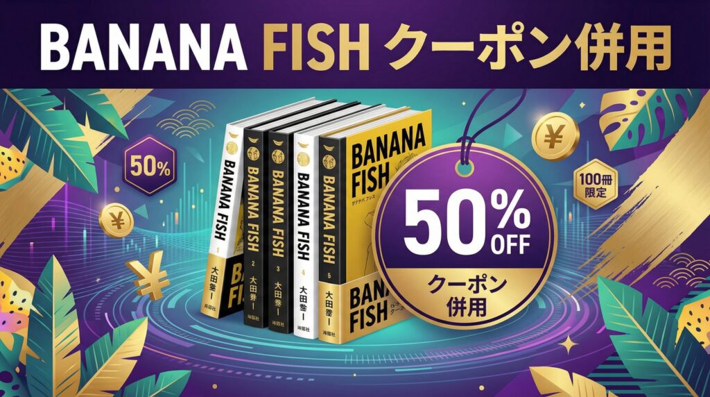 BANANA FISH全20巻は、Amebaマンガの初回限定100冊まで50%即時還元クーポンを使えば、定価11,660円が実質約5,830円で全巻まとめ買いできます。本記事では、クーポン併用のルールと具体的な手順、他社サービスとの価格比較まで徹底解説します。 【結論】BAN...