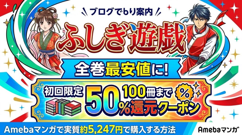 「ふしぎ遊戯」全18巻を電子書籍でまとめ買いするなら、Amebaマンガの初回限定100冊まで50%即時還元クーポンを活用するのが最安です。定価合計10,494円(税込)が、クーポン併用で実質約5,247円に。2026年2月25日時点の配信状況・価格を徹底検証しました。... -