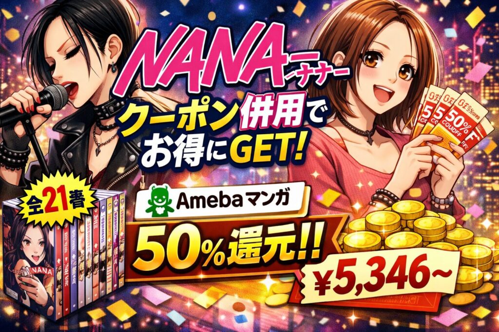 『NANA―ナナ―』はAmebaマンガで全巻配信中|クーポン併用で最安購入できる 『NANA―ナナ―』全21巻の電子書籍をクーポン併用で最安購入する方法を徹底解説します。結論から言うと、Amebaマンガの「100冊まで50%即時還元クーポン」を活用すれば、定価11,750円... -