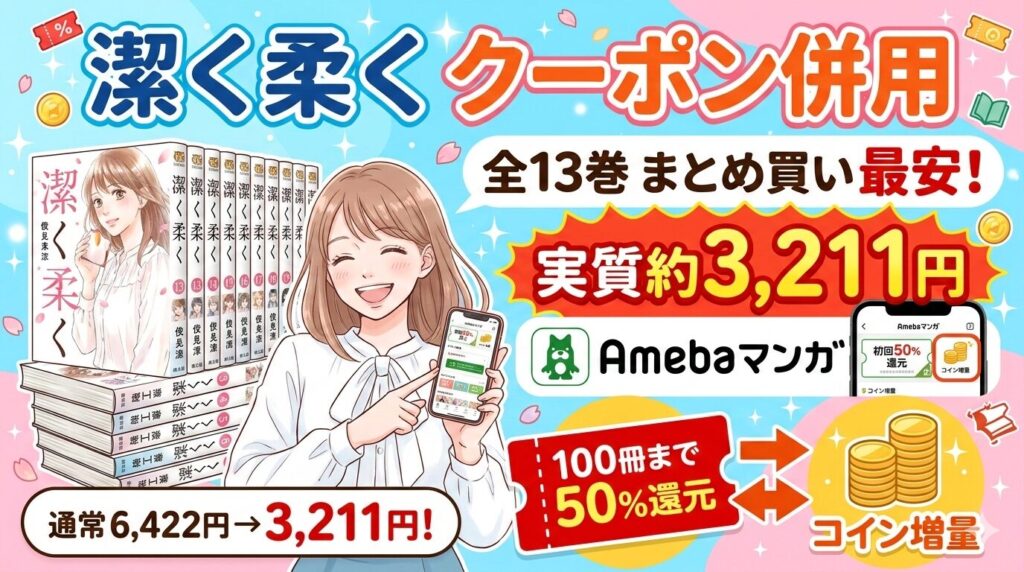 『潔く柔く(きよくやわく)』全13巻をまとめ買いするなら、Amebaマンガの初回クーポンとコイン増量を併用するのが最安です。通常6,422円相当のところ、実質約3,211円で全巻そろいます。この記事では、クーポン併用の具体的な手順と他サービスとの価格比較... -
