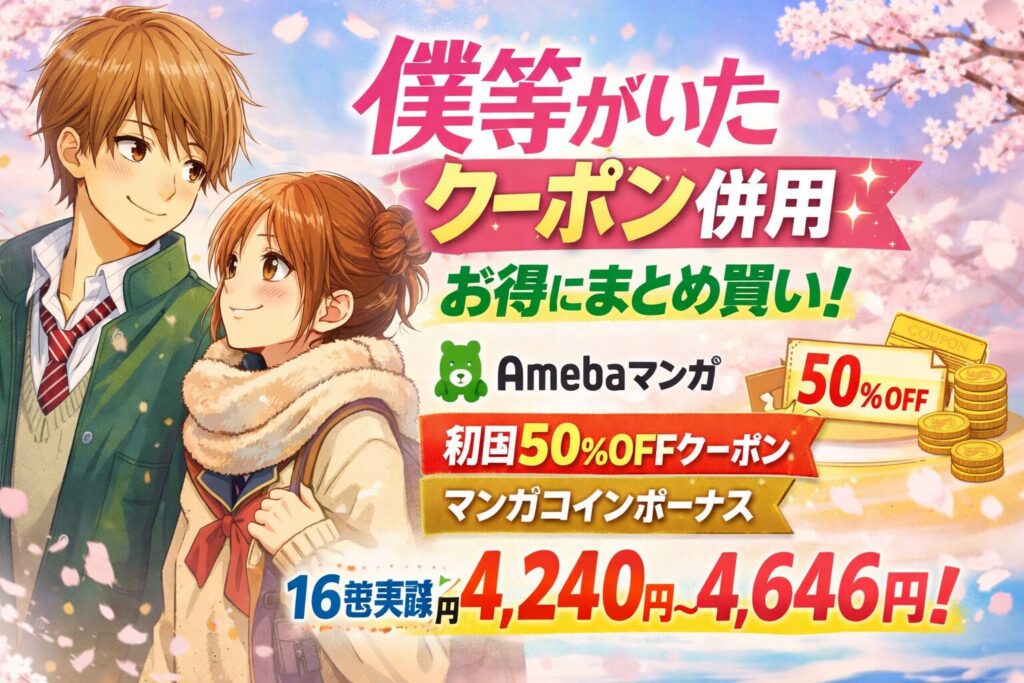 『僕等がいた』全16巻を電子書籍で最安値まとめ買いするなら、Amebaマンガの初回100冊50%即時還元クーポン+マンガコインまとめ買いボーナスの組み合わせが最もお得です。通常価格約9,328円が実質約4,240円〜4,646円になります。この記事では、2026年2月25... -