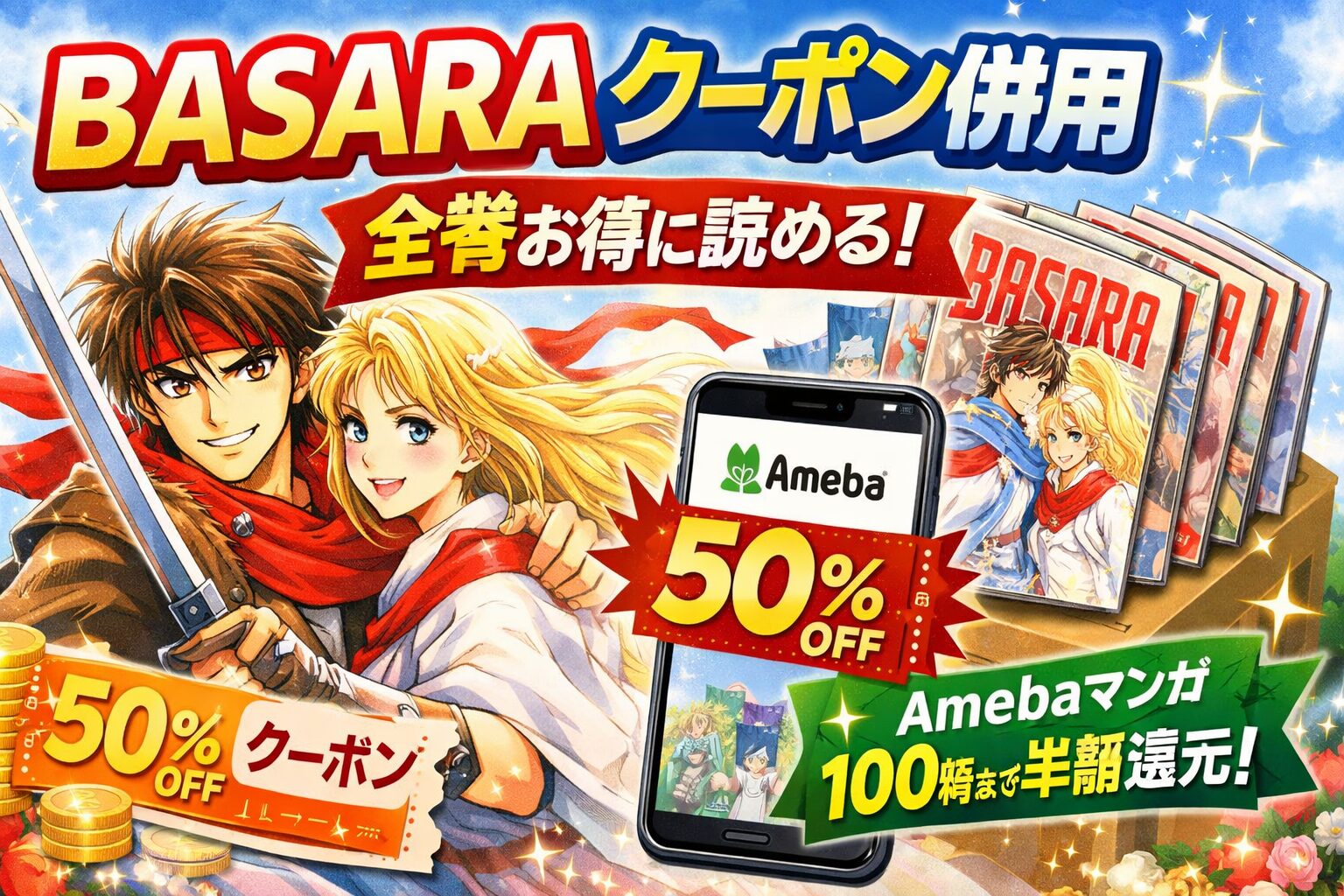 Amebaマンガではクーポン同士の併用はできませんが、「キャンペーン × クーポン」の組み合わせは可能です。たとえば、マンガコイン増量キャンペーン中にコインをまとめて購入し、その上で50%還元クーポンを使って『BASARA』を買えば、実質的な割引率はさらに上がります。コイン増量分を計算に入れると、定価から40%以上の節約が実現するケースもあります。