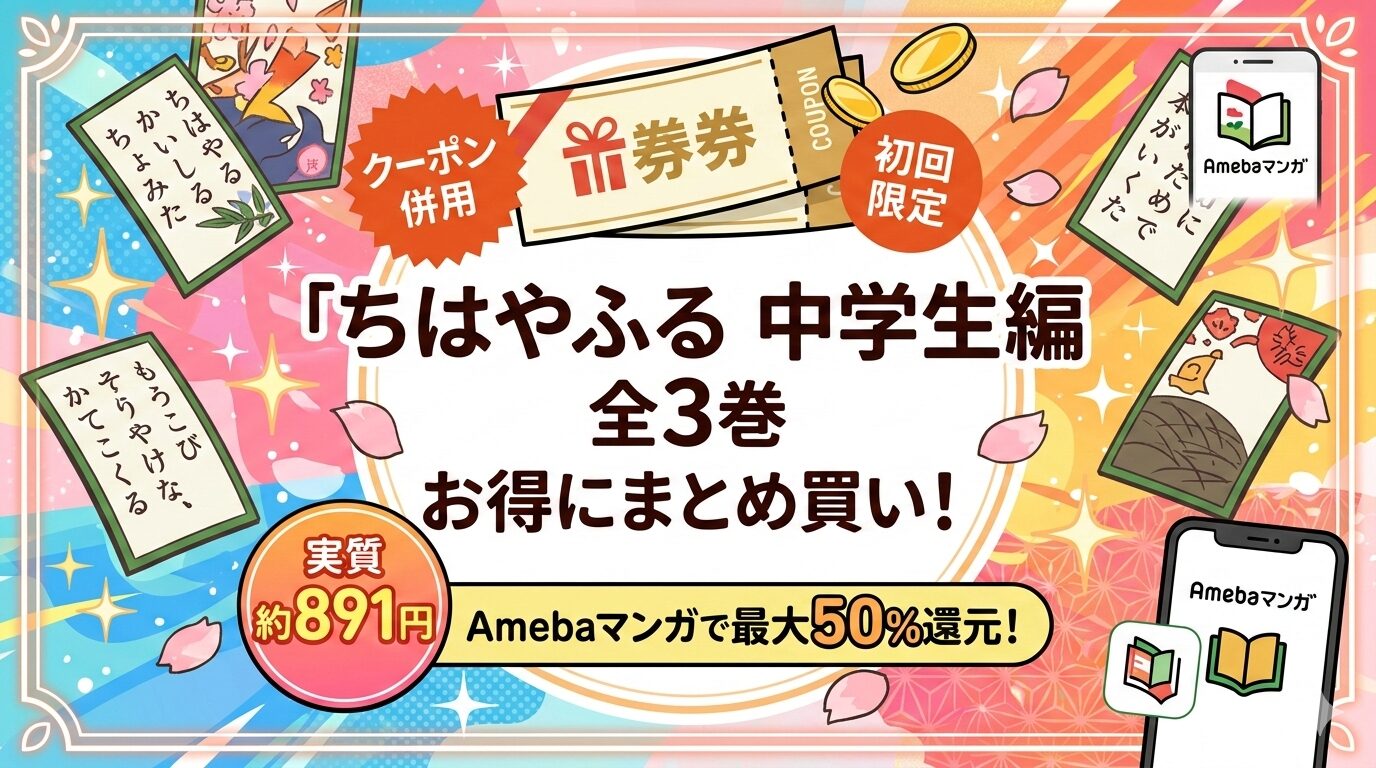 「ちはやふる 中学生編」(漫画版・全3巻)はAmebaマンガで全巻配信中です。新規登録時にもらえる「100冊まで最大50%即時還元クーポン」を使えば、全3巻を一括購入するだけで約891円分のマンガコインが還元されます。他のどの電子書籍サービスよりもお得に読める計算になります。