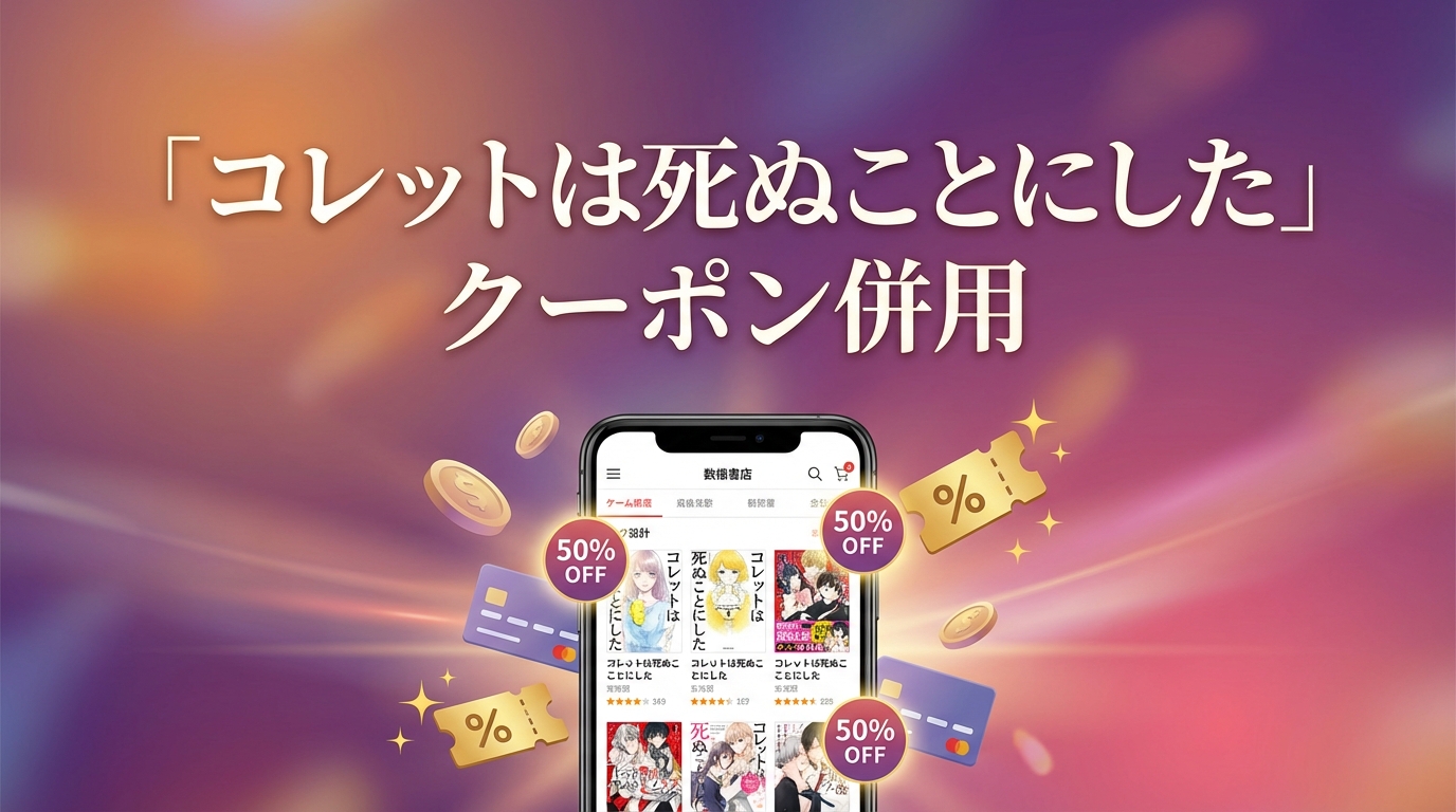 Amebaマンガに新規会員登録すると、100冊まで対象の50%即時還元クーポンがもらえます。「コレットは死ぬことにした」全21巻はこの100冊枠に余裕で収まるため、全巻にクーポンを適用できます。通常価格10,080コイン(税込約11,088円相当)に対して50%のマンガコインが還元されるので、実質約5,544円で全巻購入が可能です。