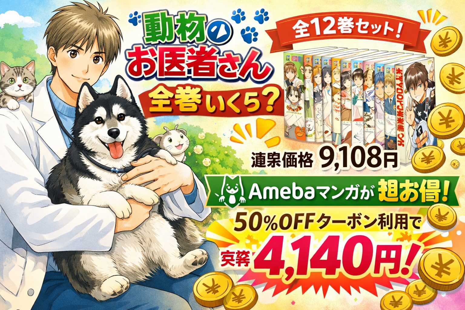 『動物のお医者さん』新装版は全12巻で完結しており、電子書籍の通常定価は全巻合計9,108円(税込)です。しかしAmebaマンガの初回100冊50%即時還元クーポンを使えば、実質約4,140円で全巻を揃えることができます。この記事では各ストアの価格比較と、最もお得なまとめ買い方法を詳しく解説します。