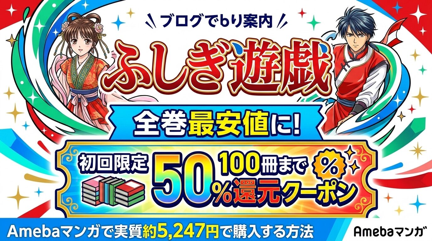 「ふしぎ遊戯」全18巻を電子書籍でまとめ買いするなら、Amebaマンガの初回限定100冊まで50%即時還元クーポンを活用するのが最安です。定価合計10,494円(税込)が、クーポン併用で実質約5,247円に。2026年2月25日時点の配信状況・価格を徹底検証しました。