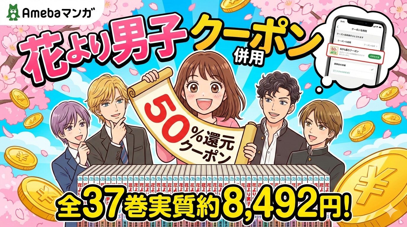 花より男子全37巻の電子書籍を最もお得に手に入れる方法は、Amebaマンガの「100冊まで50%即時還元クーポン」と月額プラン特典の組み合わせです。定価16,983円の全巻セットが実質約8,492円前後まで下がり、他のどの電子書籍サービスよりも安く全巻を揃えられます。