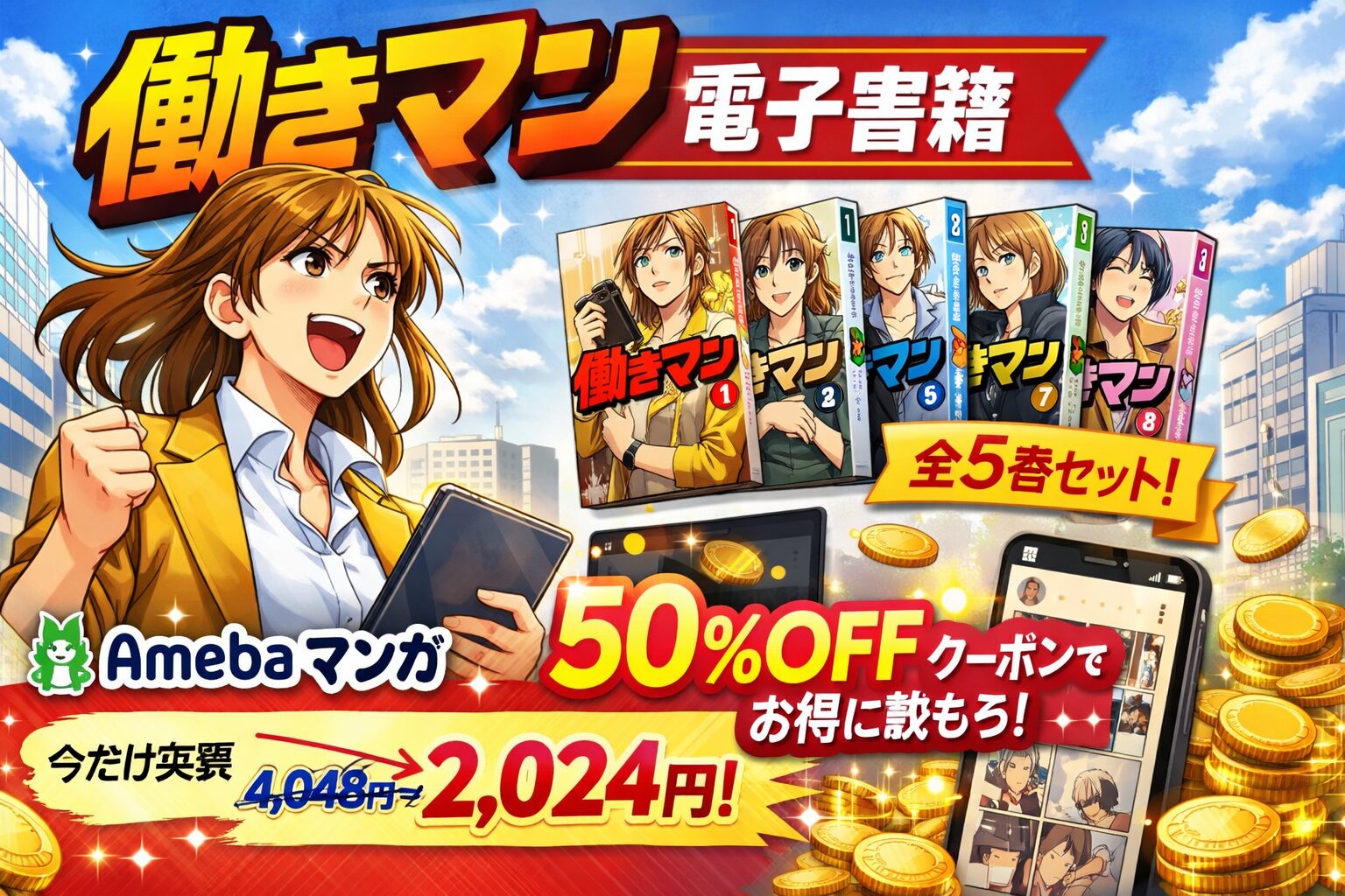 Amebaマンガでは、新規登録時に100冊まで最大50%の即時還元クーポンが利用できます。『働きマン』は全5巻なので、100冊の枠に余裕で収まります。通常価格4,048円(税込)の全巻セットが実質約2,024円になるため、約2,000円もの節約になります。