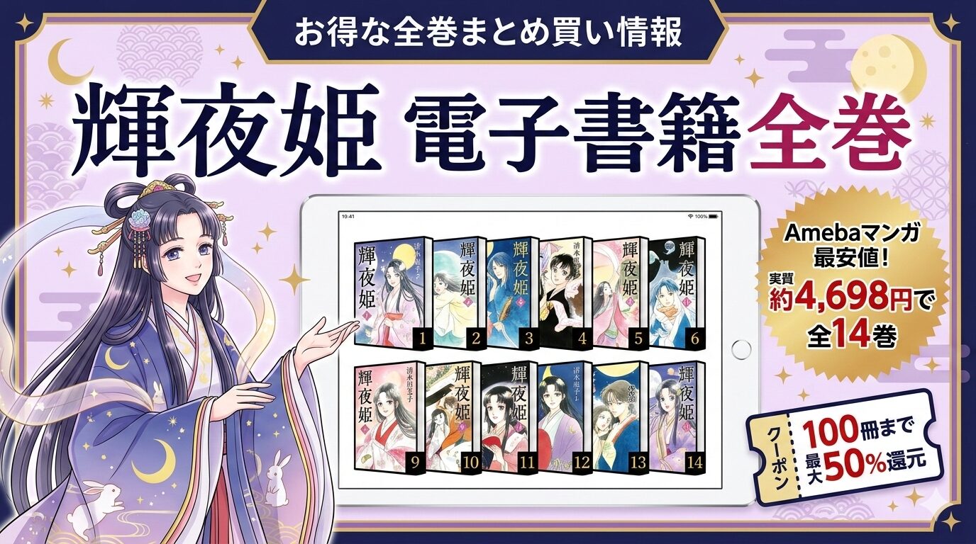 「輝夜姫」は電子書籍版(白泉社文庫版)全14巻が各主要ストアで配信されています。通常価格で全巻購入すると9,395円(税込)ですが、Amebaマンガの初回限定クーポンを活用すれば実質約4,698円と、約4,697円もお得にまとめ買いが可能です。14巻すべてが100冊の枠内に収まるため、全巻をフルに半額で入手できます。