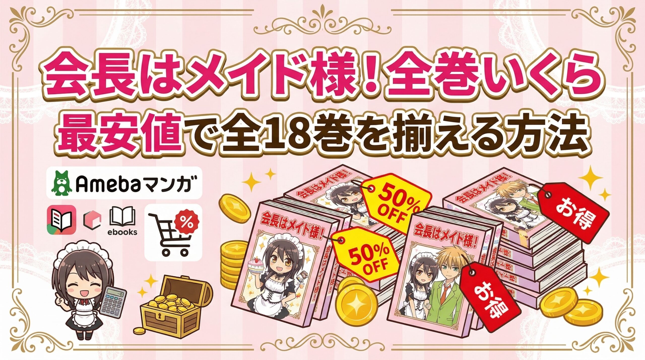 「会長はメイド様!」全18巻を電子書籍でまとめ買いすると通常価格は9,504円(税込)ですが、Amebaマンガの初回クーポン(100冊まで50%即時還元)を使えば実質約4,752円で全巻を揃えられます。2026年3月時点でもっともお得な購入方法を、他サービスとの比較とあわせて詳しく解説します。