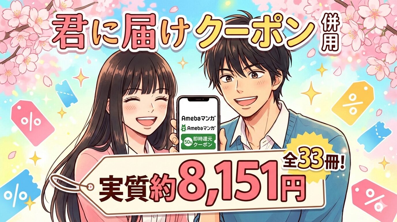 『君に届け』全33冊(本編30巻+番外編3巻)の電子書籍をまとめ買いするなら、Amebaマンガの初回クーポンを活用するのが最もお得です。定価約16,302円のところ、100冊まで50%即時還元クーポンを適用すれば実質約8,151円で全巻そろいます。2026年2月22日時点で全巻配信確認済みです。
