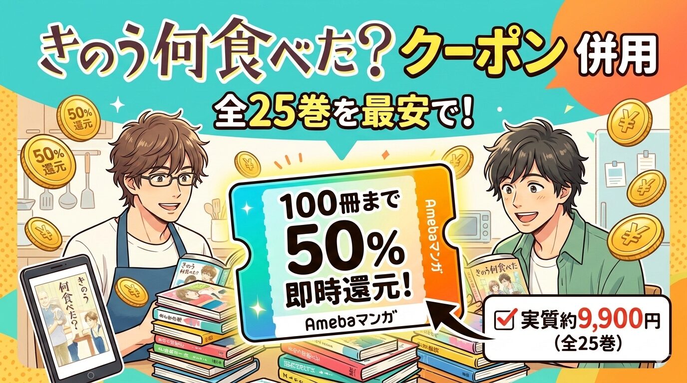 「きのう何食べた?」全25巻を最もお得にまとめ買いするなら、Amebaマンガの「100冊まで50%即時還元クーポン」が最有力です。定価合計19,866円のところ、50%還元適用で実質約9,900円、さらに月額プランのコイン増量を組み合わせれば実質負担をさらに下げることもできます。