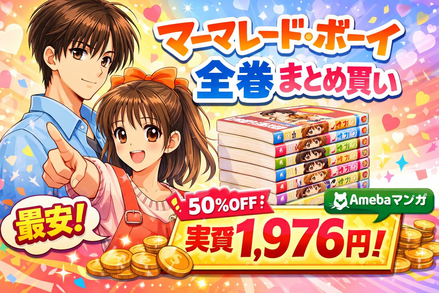 『ママレード・ボーイ』全8巻を電子書籍でまとめ買いするなら、Amebaマンガの初回限定100冊50%即時還元クーポンが最もお得です。通常3,952円相当の全巻セットが実質約1,976円で購入できます。この記事では価格比較やクーポンの使い方、作品の魅力を2026年3月最新情報で徹底解説します。