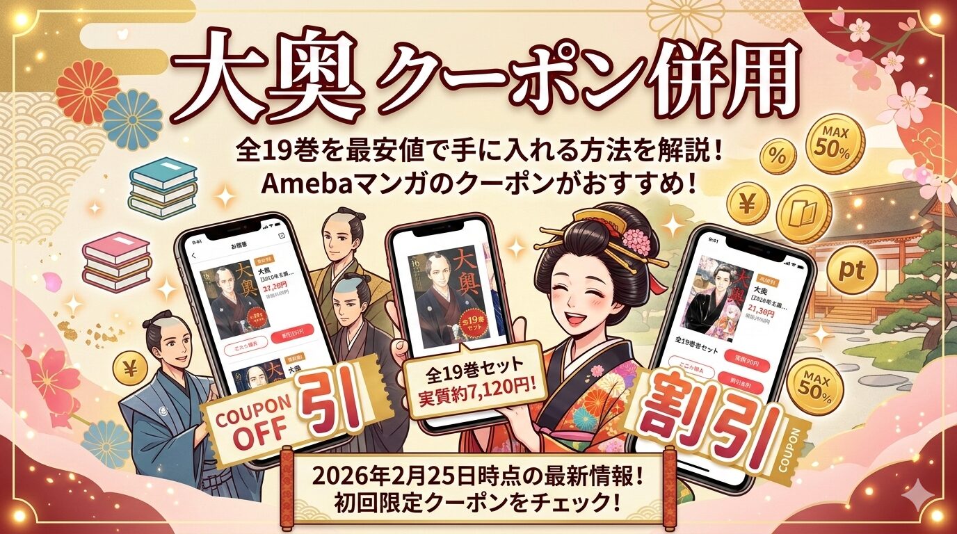 よしながふみの傑作歴史改変マンガ『大奥』全19巻を、電子書籍のクーポン併用で最安値で手に入れる方法をお探しですか?結論からお伝えすると、Amebaマンガの初回限定100冊まで最大50%即時還元クーポンを使えば、定価約14,239円の全巻セットが実質約7,120円で購入できます。2026年2月25日時点の最新情報をもとに、具体的な手順と価格比較を徹底解説します。