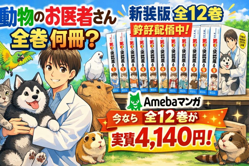 『動物のお医者さん』は、現在入手できる新装版で全12巻(完結済み)です。旧版・文庫版・愛蔵版を含めると4種類の版が存在しますが、電子書籍で購入できるのは新装版のみ。Amebaマンガなら初回クーポンで全巻を実質4,140円相当で揃えられます。 結論:Ame... -