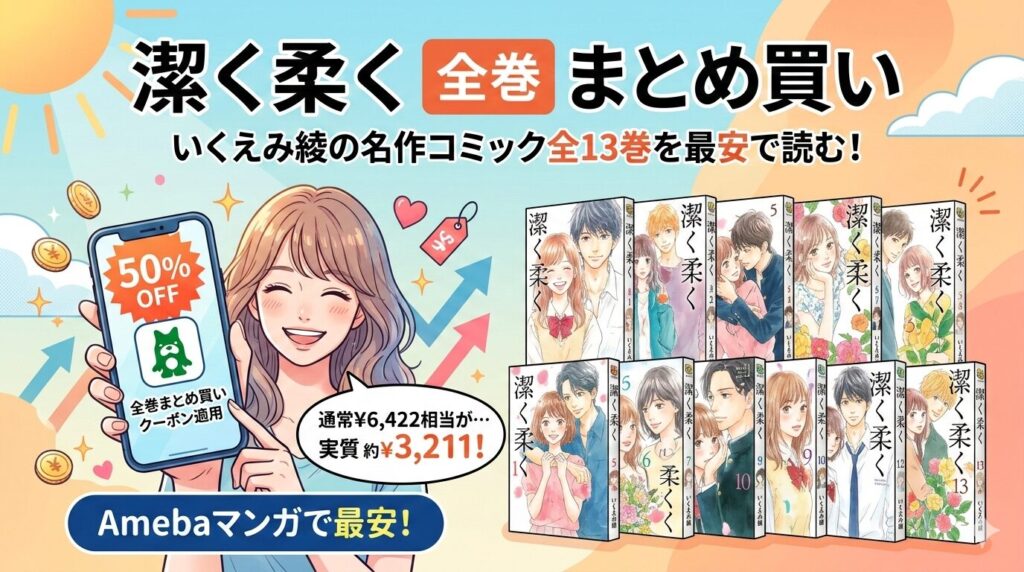いくえみ綾先生の名作『潔く柔く(きよくやわく)』全13巻をまとめ買いするなら、Amebaマンガの初回クーポン(100冊まで50%即時還元)を使うのが最安です。通常6,422円相当のところ、実質約3,211円で全巻そろえることができます。この記事では、価格比較や... -