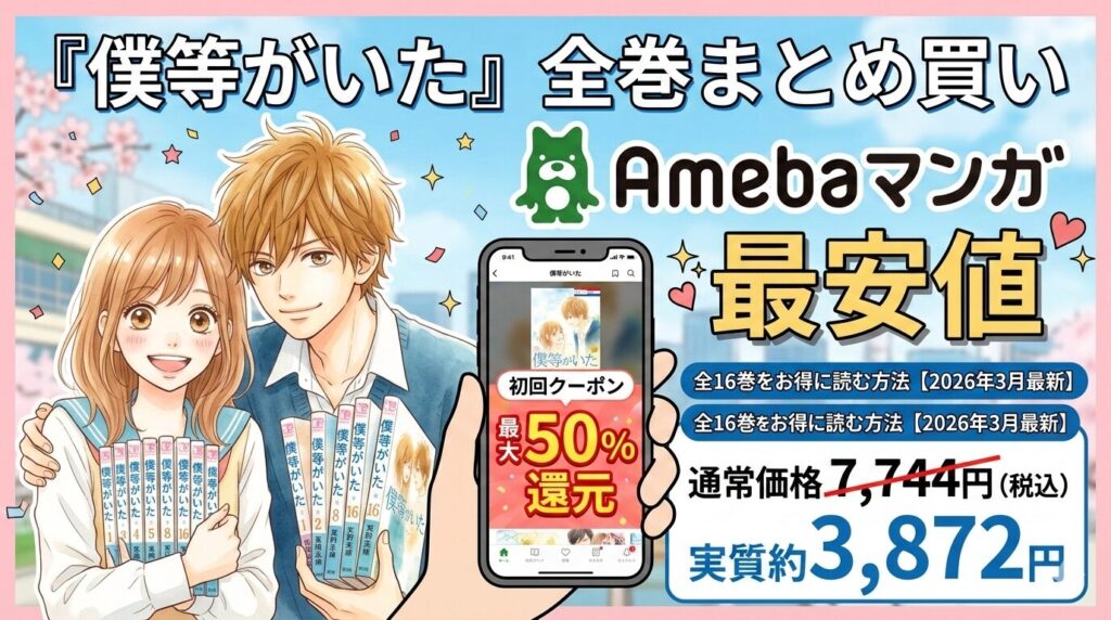 『僕等がいた』全巻まとめ買いの最安値はAmebaマンガ|全16巻を最大50%還元でお得に読む方法【2026年3月最新】 『僕等がいた』全16巻を電子書籍でまとめ買いするなら、Amebaマンガの初回クーポン(100冊まで最大50%即時還元)を使うのが最安です。通常価格... -