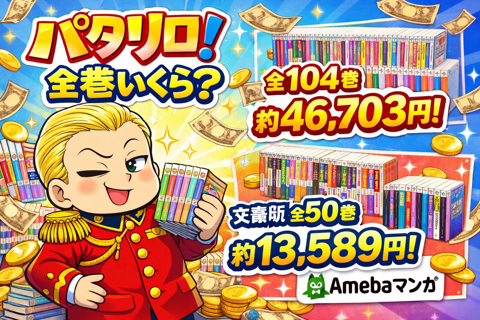 「パタリロ!」を全巻そろえたいけれど、一体いくらかかるのか気になりますよね。結論から言うと、紙の単行本(花とゆめコミックス)全104巻は新品で約46,703円、電子書籍の文庫版50巻ならAmebaマンガの初回クーポンで実質約13,589円まで抑えられます。