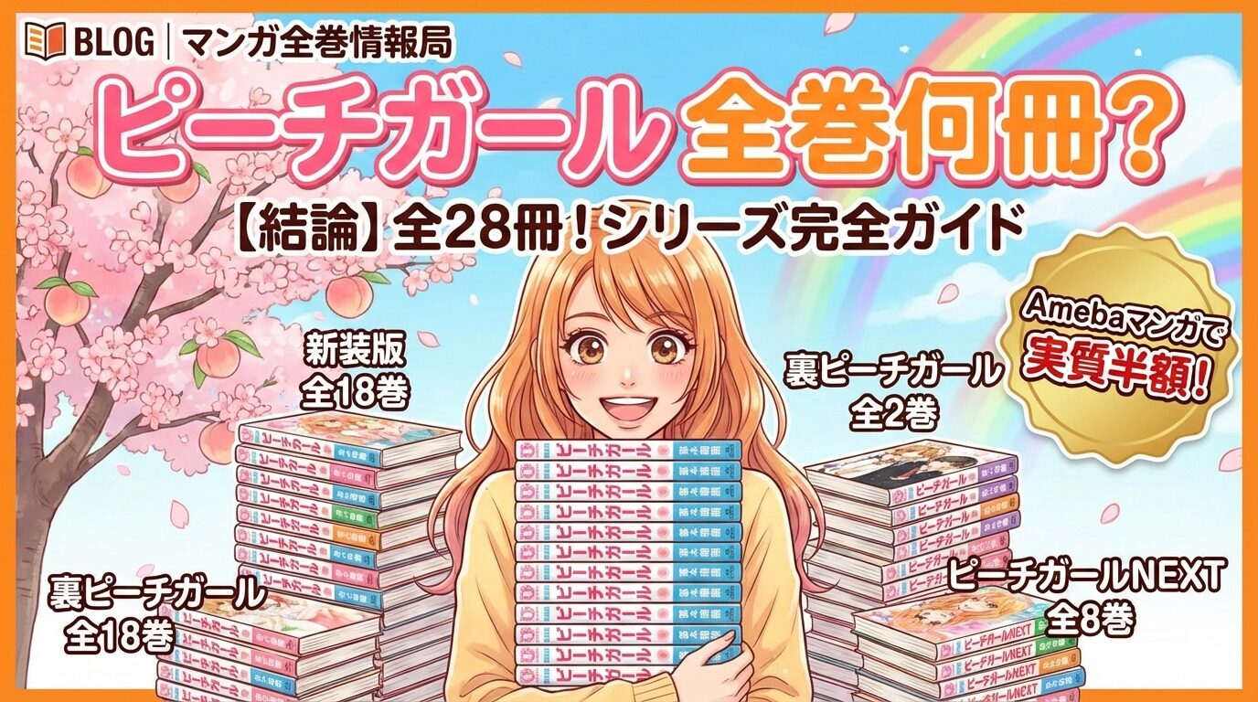 「ピーチガールって全部で何巻あるの?」「シリーズ全部読むと何冊になる?」そんな疑問を抱えている方へ、結論からお伝えします。ピーチガールはシリーズ合計で全28冊です。内訳は本編(新装版)全18巻、裏ピーチガール全2巻、続編のピーチガールNEXT全8巻。Amebaマンガの初回100冊50%即時還元クーポンを使えば、シリーズ全巻を実質半額近くでまとめ買いできます。