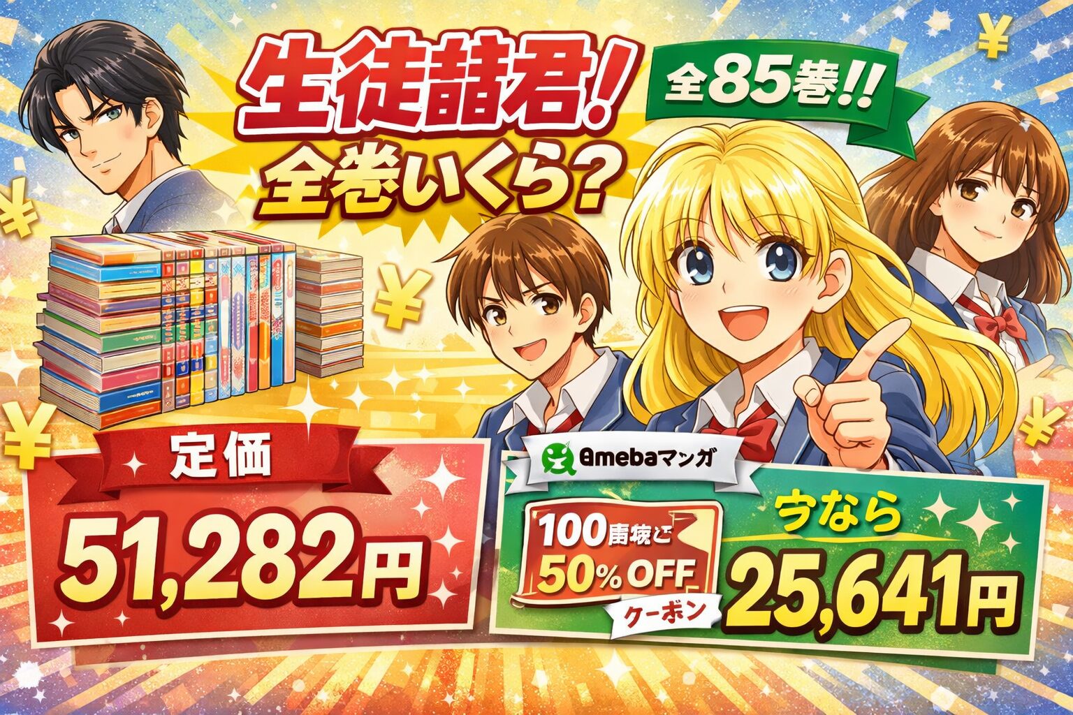 『生徒諸君!』シリーズ全5作品・計85巻を電子書籍でまとめ買いした場合の定価合計は約51,282円(税込)です。しかし、Amebaマンガの初回限定「100冊まで50%即時還元」クーポンを使えば、実質約25,641円で全巻を購入できます。2026年3月1日時点で全巻配信を確認済みです。