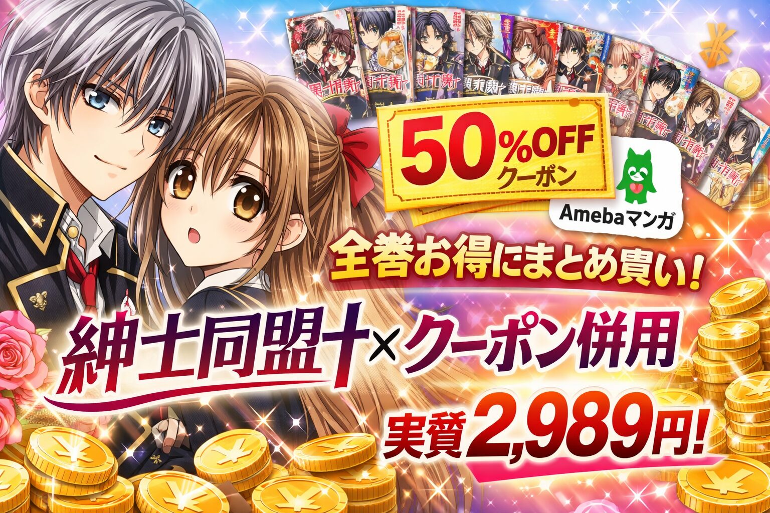 紳士同盟†(クロス)全11巻の電子書籍をクーポン併用で最もお得にまとめ買いする方法をお探しですか?結論から言うと、Amebaマンガの初回100冊まで50%即時還元クーポンを使えば、定価5,977円(税込)の全巻セットが実質約2,989円で手に入ります。2026年2月22日時点の最新情報をもとに、具体的な手順と節約テクニックを徹底解説します。