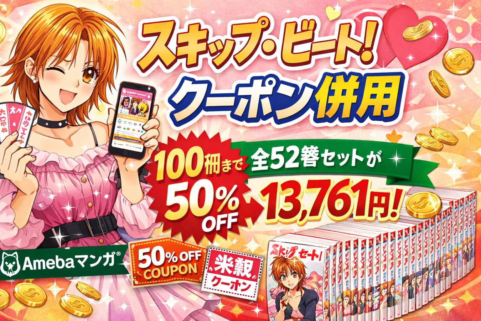 「スキップ・ビート!」全52巻を電子書籍でまとめ買いするなら、Amebaマンガの初回限定「100冊まで50%即時還元クーポン」が最もお得です。定価27,522円(税込)の全巻セットが、クーポン適用と還元コインの活用で実質約13,761円にまで抑えられます。この記事では、2026年2月25日時点の最新情報をもとに、クーポン併用の具体的なテクニックや他社比較を徹底解説します。