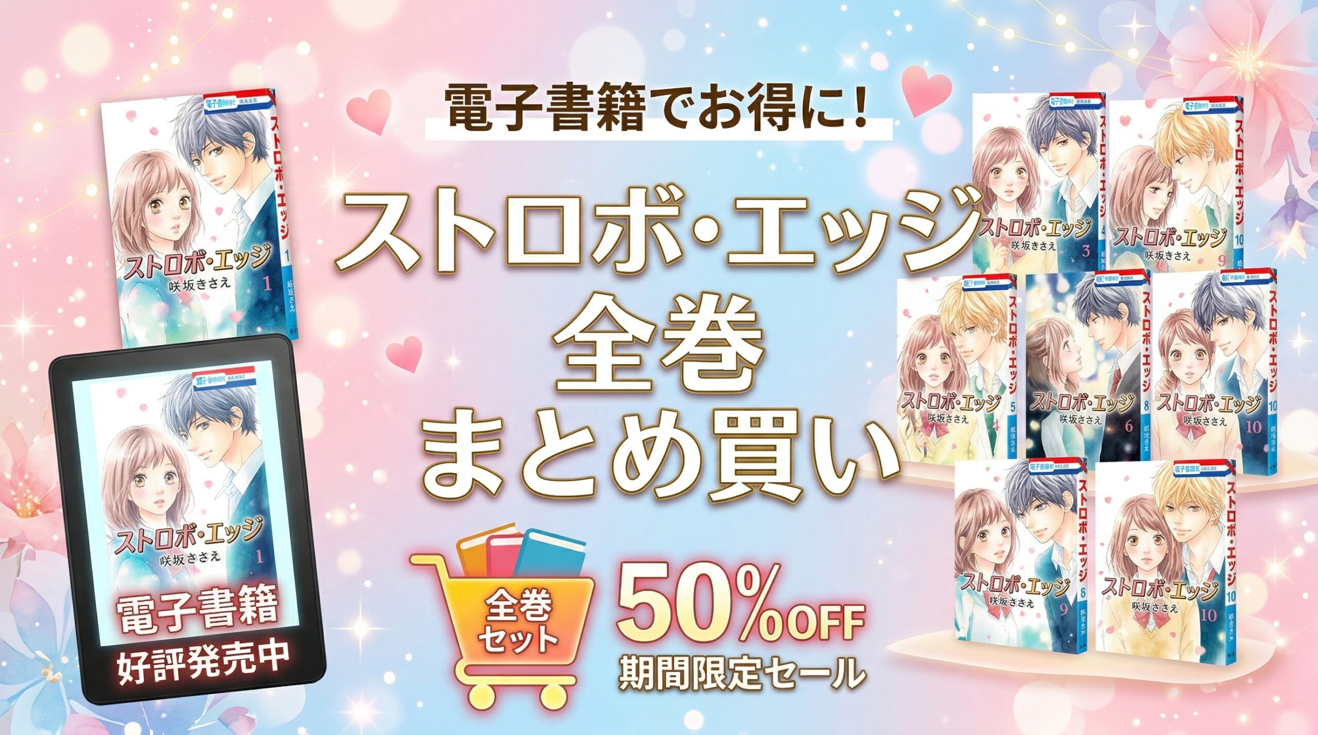 『ストロボ・エッジ』全10巻を最もお得にまとめ買いするなら、Amebaマンガの初回限定50%即時還元クーポンの利用がベストです。電子書籍の定価約5,430円が実質約2,715円となり、紙の単行本(5,720円)と比較すると約3,000円もの節約になります。