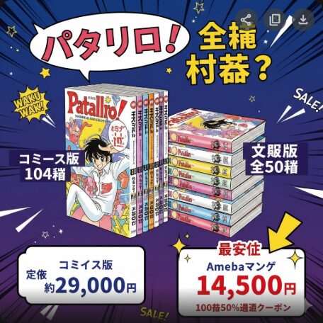 パタリロ!は全巻何冊?コミックス版104巻・文庫版50巻。電子書籍なら文庫版全50巻が定価約29,000円のところ、Amebaマンガなら約14,500円で購入可能。2026年2月最新の価格比較と最安で買う方法を解説。