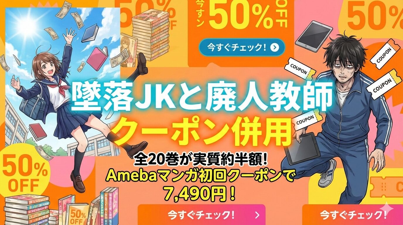 『墜落JKと廃人教師』全20巻をクーポン併用で最安に買う方法をお探しですか?結論から言うと、Amebaマンガの初回100冊50%即時還元クーポンを使えば、定価合計14,980円が実質約7,490円で全巻まとめ買いできます。2026年2月26日時点の配信状況・併用ルール・具体的な手順をすべて解説します。